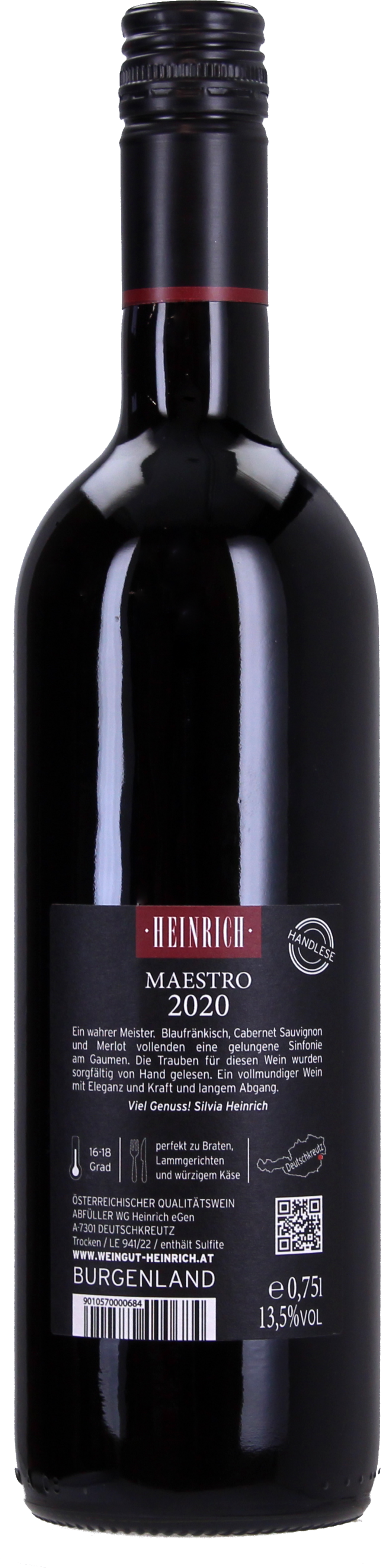 Il blend rosso Maestro è un vero capolavoro. Un'assemblaggio virtuoso che si scioglie al palato, nato da Blaufränkisch, Merlot e Cabernet Sauvignon.